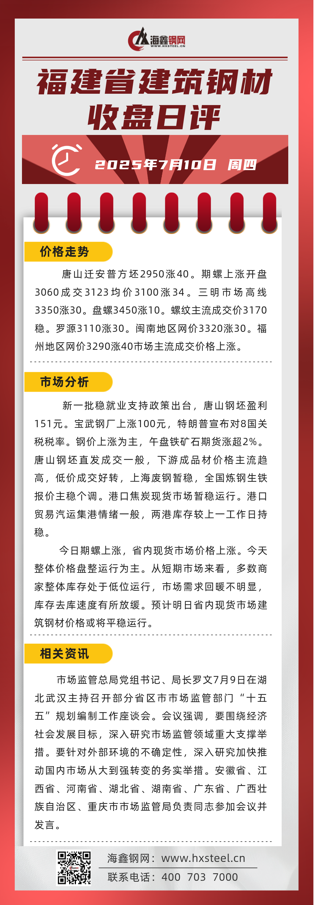 7月10日福建省內建筑鋼材收盤日評