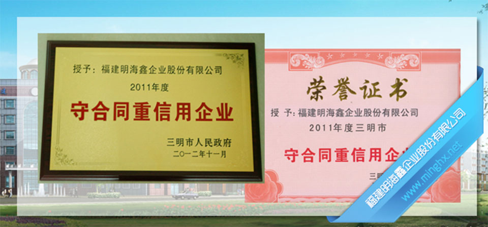 福建明海鑫企業股份有限公司被三明市人民政府授予:2011年度三明市守合同重信用企業。